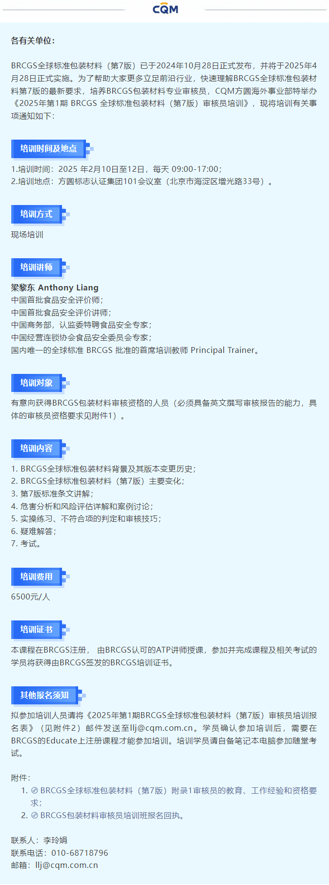 九游·jiuyou(中国)体育官方网站举办2025年第1期BRCGS全球标准包装材料(第7版)审核员培训的通知