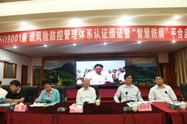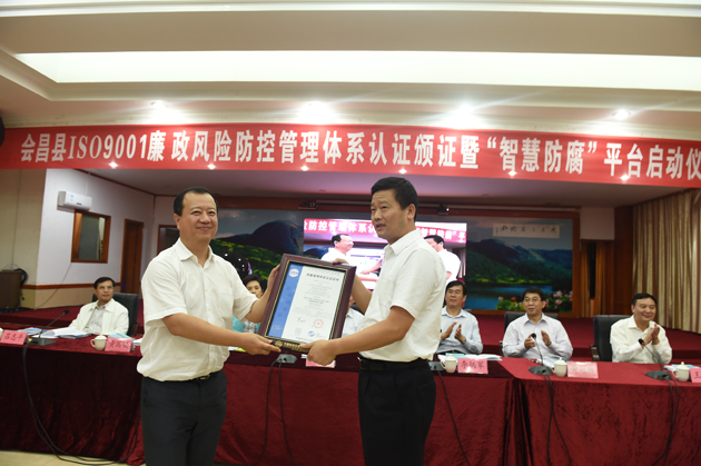 10月23日下午,江西省会昌县举行“基于质量管理体系标准的廉政风险防控管理体系”认证颁证暨“智慧防腐”平台启动仪式。在国家质检总局局长支树平,江西省委常委、赣州市委书记李炳军,江西省副省长谢茹等领导的见证下,方圆集团董事长高建忠向会昌县委、县政府颁发了全国首张廉政风险防控管理体系认证证书。