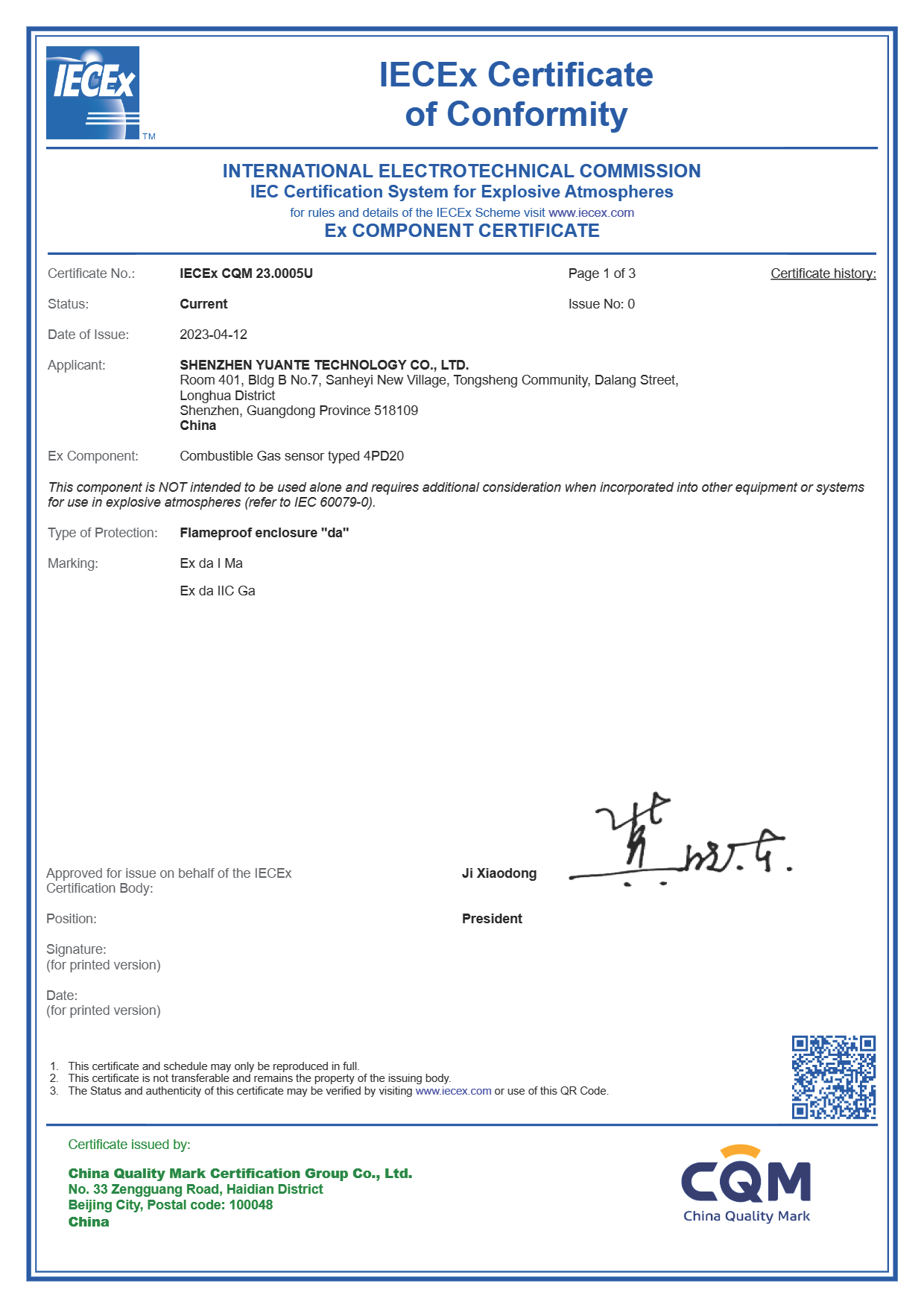 4月19日,九游·jiuyou(中国)体育官方网站为深圳市元特科技有限公司自主研发和生产的可燃性气体传感器颁发了IECEx认证证书,这是中国加入IECEx设备认证体系以来,中国机构为适用于0区、EPL Ga的隔爆型可燃性气体传感器的首张IECEx证书。