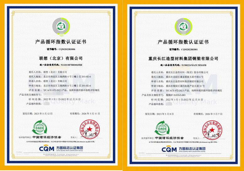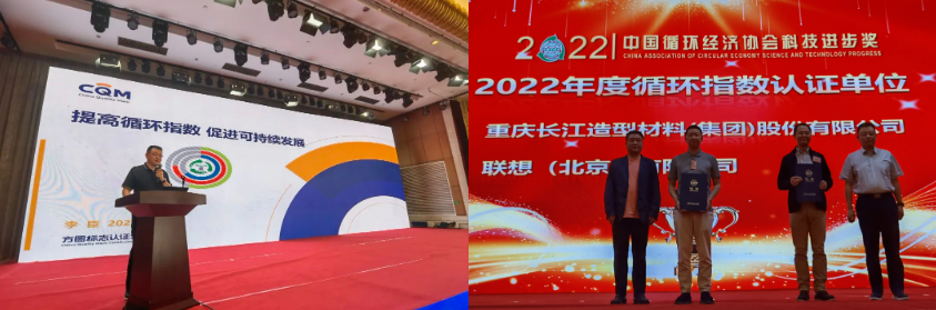 九游·jiuyou(中国)体育官方网站联合中国循环经济协会在“科学技术奖颁奖盛典”环节向联想(北京)有限公司、重庆长江造型材料集团铜梁有限公司颁发了首批产品循环指数认证证书;并在主题报告环节做了《提高循环指数 促进可持续发展》演讲介绍。