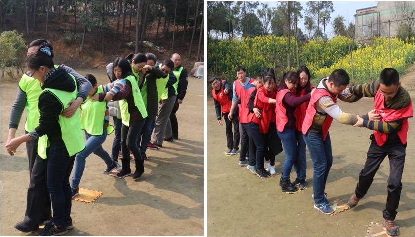 “搭桥过河”游戏中,两队激烈的比拼,团结一致,相互帮扶,确保每一位队员顺利通过,到达彼岸